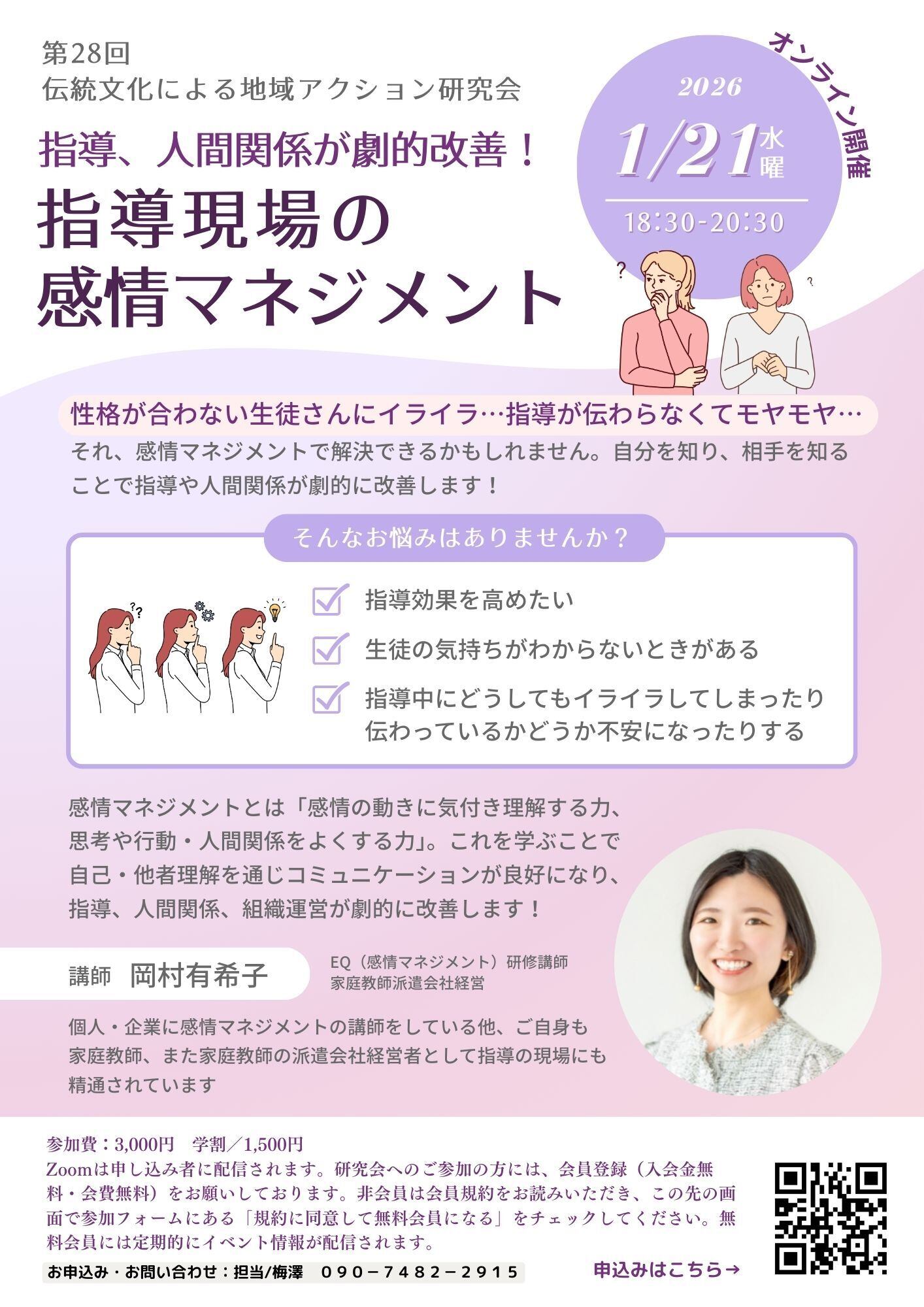 そんなお悩みはありませんか。今回の講師は、感情マネジメント(EQ)の専門家、岡村有希子さんです。個人・企業に感情マネジメントの講師をしている他、ご自身も家庭教師、また家庭教師の派遣会社経営者として指導の現場にも精通されています、